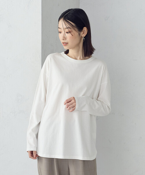 \1枚着としてはもちろん、レイヤードスタイルにも重宝する万能カットソー/《デザイン》シンプルなコーディネートでもおしゃれに見えるロンT。後中心のスリットが軽やかな抜け感を演出します。詰まり過ぎないネックライン、程よいオーバーサイズで身体のシルエットを拾いません。袖はレイヤードした時に、もたつかないようにスッキリ仕上げています。一枚着で着た時も腕回りがスッキリと見えます。着丈は前後で差をつけたラウンドヘムにしました。ヒップが隠れるのも嬉しいポイントです!トレーナーやニットのインナーとしても使えてデイリーに大活躍間違いなし!《素材》柔らかくて軽く通気性が良いコーマ糸の綿天竺です。コーマ糸は通常の綿糸より繊維が細かく毛羽立ちが少ないため滑らかな手触りが特長です。お手入れが簡単でデイリーに着られます。……………………透け感:ほぼ無し厚さ:普通伸縮性:あり光沢感:なし裏地:なし洗濯方法:洗濯機(弱)OK……………………