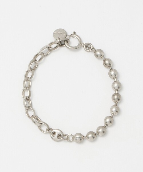 マットなシルバーカラーのボールチェーンと、インダストリアルなチェーンを組み合わせた、構築的バランスが魅力のブレスレット。異なるリズムをもつチェーンを1本に繋げることで、洗練と抜け感を共存させたデザインです。素材:真鍮(銀メッキ/ノンニッケル)■メーカー品番: IB-102/BALL LINK CHAIN -bracelet<in mood(インムード)>その時々の”気分で”様々なスタイルを楽しむ大人の女性に向けてのブランド。「リアルクローズに合わせられる品のあるアイテム」in moodのアイテムをMIXすることにより、リアルクローズでありながら華のあるスタイルを目指しています。「ファッション好きな女性が、毎シーズン好みのアイテムを買えるように」という思いから、主に真鍮などを素材として使用することで手の届く価格帯を実現しています。【注意事項】※金属アレルギーのある方は素材をご確認の上ご使用ください。※金属部の表面に小さな傷、気泡、凹みなどがみられる場合がございますが、加工の特性上発生するものであり、不良品ではございませんので予めご了承ください。※商品に「取り扱い上の注意書き」、「洗濯表示」がございます場合は、使用前に必ずご確認ください。※商品画像は、光の当たり具合やパソコンなどの閲覧環境により、実際の色味と異なって見える場合がございます。あらかじめご了承ください。※商品の色味の目安は、商品単体の画像をご参照ください。店舗へお問い合わせの際は、全国のASTRAET各店舗まで下記の品名/品番をお申し付けください。品名:im BALL LINK CHN BRACE 品番:54335000046