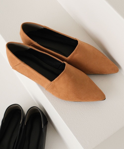 2WAYでスマートに楽しむ、快適な履き心地 柔らかく快適な履き心地のバブーシュ。 かかとを踏んでラフにも、しっかり履いて きちんとスタイルにも使える2WAY仕様。 ポインテッドトゥが足元をシャープに演出し、スタイリングを格上げします。 甲部分はステッチを使わないデザインで足当たりも良く、 長時間履いても疲れにくい構造です。 トラッド感のあるきれいめシルエットは、あらゆるコーデにマッチし、 デイリーに活躍する頼れる一足です。