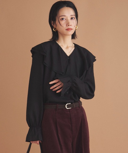 1枚で着映えするブラウス 【point】 ・大きめのフリルが顔回りを華やかに ・袖口にゴムが入っていて、たくし上げるとボリューム感と抜け感が生まれます ・冬はニットやカーデのインナーとしても活躍します 【fabric】 ・薄手で柔らかくさらっとした肌触り 透け感:淡色あり 裏地:なし 伸縮性:なし 光沢感:なし 生地の厚さ:やや薄手 【注意事項】 ・画像の商品はサンプルです。実際の商品と仕様、加工が若干異なる場合があります。 ・サイズ表記はあくまで目安となります。 ・取り扱いについては、商品についている品質表示でご確認ください。 ・照明の関係により、実際より明るく見える場合がございます。またパソコンなどの環境により、製品と画像のカラーが若干異なる場合がございますので、予めご了承くださいませ。 ■お気に入り登録がオススメです!■ 《商品のお気に入り登録》 カラー・サイズ選択の横の「♡」をクリックで簡単に登録できます 完売カラーの再入荷や在庫が1点になったとき、セールになったときに通知をお届けします 《ブランドのお気に入り登録》 ページ上部のブランド名の「♡ お気に入りブランドに追加」をクリックで簡単に登録できます 新商品の情報やイベントなどお得な情報をいち早くお届けします 是非、ご登録お願いします♪