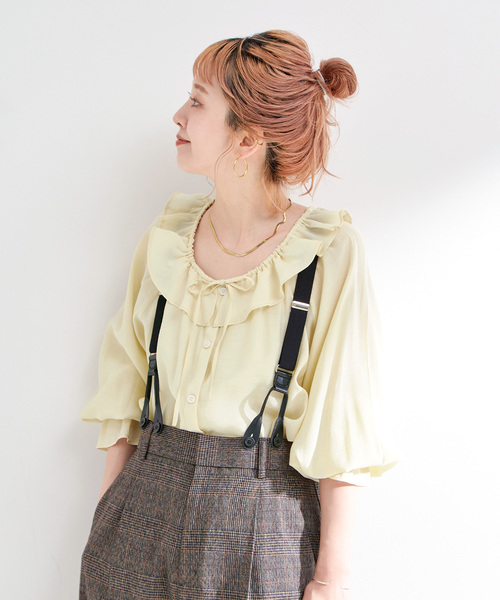 襟元に華やかなフリルカラーを付けた着回しの幅が広がるブラウス。ほのかに微光沢ですが膨らみのある素材で一枚着ももちろん、これからの季節のレイヤードスタイルにインナー使いで活躍する薄手のフリルブラウスです。フロントリボンを絞って首周りの開きを調整でき、絞りを強くするとギャザーがでてフリルの立体感が増しより華やかな印象になります。手洗い可能でご自宅でのイージーケアができるのも嬉しいポイントです!**********************透け感:ややあり裏地:なし伸縮性:なし光沢感:ほのかに微光沢生地の厚さ:やや薄手**********************【スタッフ着用コメント】《スタッフ staff.Y》身長:160cm/普段サイズ:M-L/着用サイズ:フリーサイズ感:ゆったりめのサイズ感です。素材感:落ち感のある柔らかい素材。着心地:軽い着心地です。※あくまで個人の感想です。**********************※取り扱いについては、商品についている品質表示でご確認ください。・水洗いで多少縮みます。・収縮や外観変化が生じることがあるので、スチームを当てないでください。・柔軟剤は使用しないでください。縫い目が開くことがあります。※ブラック(001)カラーについて・汗が付着した場合は、早めにお手入れしてください。そのまま放置すると、変色や色落ち、色移りすることがあります。※イエロー(080)カラーについて・日光や蛍光灯の光に弱く、色あせ(変色)しやすい性質があるので、長時間の直射日光は避けてください。※こちらの商品は、B.C STOCKでの取り扱いになります。 直接店舗へお問い合わせの際はB.C STOCK店舗へお願い致します。※照明の関係により、実際よりも色味が違って見える場合があります。またパソコン・スマートフォンなどの環境により、若干製品と画像のカラーが異なる場合もございます。※商品の色味は、商品アップ画像をご参照ください。ブラック着用スタッフ:157cm 着用サイズ:フリーイエロー着用スタッフ:163cm 着用サイズ:フリー詳細着用モデル:163cm 着用サイズ:フリー本体:手洗い可能