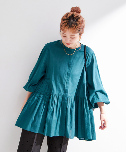 エアリーなボイル素材でお作りしたチュニックブラウス。ウエストの切り替えと細かいギャザーが入ることで、ふわっと立体的なシルエットになるのが特徴のブラウスです。着丈を長めに設定しミニワンピースのような雰囲気なので、ショーツと合わせてトレンド感ある着こなしもおすすめです。前開き仕様で羽織りとしても着用出来ます。手洗い可能でご自宅でのイージーケアができるのも嬉しいポイントです!**********************透け感:ややあり裏地:なし伸縮性:なし光沢感:なし生地の厚さ:やや薄手**********************【スタッフ着用コメント】《スタッフ staff.Y》身長:160cm/普段サイズ:M-L/着用サイズ:フリーサイズ感:全体的にゆったりめのサイズ感。素材感:やや薄手の素材感で柔らかいです。着心地:軽くエアリーな着心地です。長袖ですが袖ゴムで袖丈を調整できるので夏も涼しく着れそうです。※あくまで個人の感想です。**********************※取り扱いについては、商品についている品質表示でご確認ください。・形を整えて干してください。洗濯により収縮やねじれ。型崩れすることがあります。・着用中の摩擦や、汗、水濡れにご注意ください。濃色品は、色落ちや他のものへ色移りすることがあります。※こちらの商品は、B.C STOCKでの取り扱いになります。 直接店舗へお問い合わせの際はB.C STOCK店舗へお願い致します。※照明の関係により、実際よりも色味が違って見える場合があります。またパソコン・スマートフォンなどの環境により、若干製品と画像のカラーが異なる場合もございます。※商品の色味は、商品アップ画像をご参照ください。ブラック着用スタッフ:157cm 着用サイズ:フリーホワイト、グリーン着用スタッフ:163cm 着用サイズ:フリー詳細着用モデル:163cm 着用サイズ:フリー本体:手洗い可能