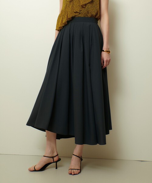 【allureville 2025 autumn&winter】繊細な細番手の糸を使った軽やかで優しい風合いの生地で作ったイレギュラーヘムタックスカートコットンライクでナチュラルな表情を持ちつつポリエステル100%という夏に嬉しいイージーケア素材です。アシンメトリーになったヘムラインや太さや深さを変えたタックで全方位から見て華やかに、ニュアンスを出した1枚。差し色のパープルがパッと目を引くポイントになっています。ふわりと軽やかに広がるボリューム感のあるシルエットなのでコンパクトなトップスをINして頂いたり秋にはスウェットなどボリュームトップスをアウトで着て頂いてもイレギュラーなヘムラインが華やかなルックになります。【スタッフコメント】デザイン性のあるトップスはもちろん、シンプルなトップスとのスタイリングも華やぐ主役級スカート。イレギュラーヘムデザインがおしゃれな印象に。アシンメトリーになっており、360度どこから見てもニュアンスのある素敵なスカートです。分量感たっぷりでふんわりと上品な揺れ感がポイント。落ち感があり着膨れしにくいのも嬉しいポイントです。軽やかな履き心地でシーズンレスで履きやすい1着。いつものコーディネートをブラッシュアップしてくれるおすすめのスカートです。※手洗い可能です。※照明の関係により、実際よりも色味が違って見える場合がございます。またパソコン・スマートフォンなどの環境により、製品と画像のカラーが異なる場合もございます。予めご了承ください。