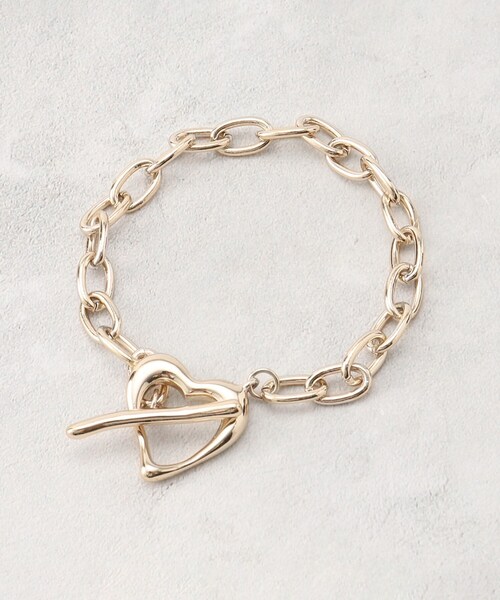 ハート型のマンテルパーツがポイントのブレスレット。【デザイン】適度なボリュームがスタイリングのポイントになるチェーンブレスレット。ハート型のマンテルパーツがかわいらしい印象です。シンプルになりがちな夏のスタイリングの手元を華やかに彩ります。※照明の関係により、実際よりも色味が違って見える場合があります。また、パソコン・スマートフォンなどの環境により、若干製品と画像のカラーが異なる場合もございます。【25AW】店舗へのお問い合わせ商品番号:769-84050●製品寸法:00:全長16.5cm 幅0.6cm備考: