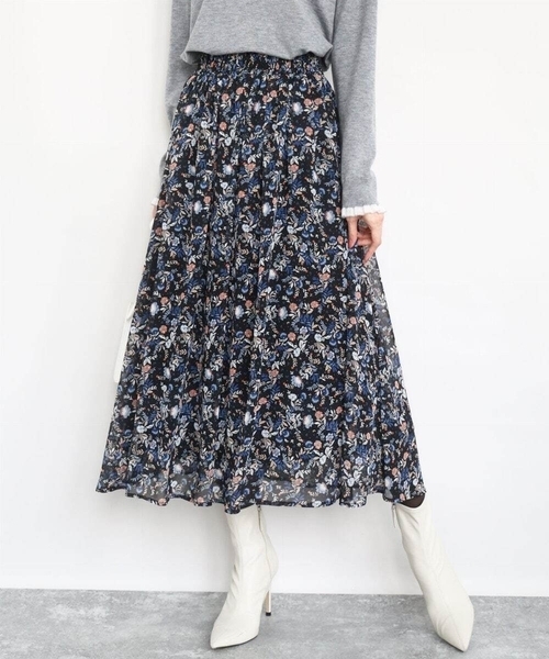 セットアップでワンピース見えの着こなしも ■デザイン 小さめのドットや繊細なリーフフラワーが散りばめられたプリントのシフォンスカート。多色使いですが、大人っぽい色合いでシックに着こなせます。落ち感がある素材は広がりすぎないので甘くなりすぎず、ウエストゴムでストレスフリーな着心地も嬉しい。 ■素材 透け感のあるシフォン素材は軽やかな印象。伸縮性のあるサテンスムースの裏地付きで透け感も気にせず、着心地アップのケアをしています。 ■コーディネート 軽やかで広がりすぎないシルエットが大人な印象で着こなせます。落ち着いた色合いはコーディネートの程よいアクセントに。同素材のブラウスとセットアップでワンピース見えの着こなしも楽しめるので、セットで持っておくと何かと便利な一枚です。 -------------------- 着用シーズン 春:◎ 夏:◎ 秋:◎ 冬:◎ -------------------- 洗濯表示:洗濯機洗い可 透け感:あり 裏地:あり 伸縮性:なし ウエスト:ゴム仕様 生地の厚さ:薄手 -------------------- ■スタッフ着用コメント <スタッフ身長:153cm/着用サイズM(38)/普段の着用サイズS(36)~M(38) > スカートはシワになりにくくウエストが総ゴムなのでご旅行などラクチンスタイルにもピッタリです。シフォン素材の女性らしいふんわり感はありながら広がりにくいシルエットが◎。身長153㎝でくるぶしが隠れる長めの着丈ですが、軽やかな裾のシアー感があり小柄な方もバランス良く着用頂けます。 <スタッフ身長:157cm/着用サイズM(38)/普段の着用サイズS(36)~M(38)> 大人可愛い印象の小花柄スカートです。落ち感がある素材で広がりは抑えめなので、甘めなコーディネートが苦手な方にもおすすめです。ウエストはゴムで楽な履き心地です。同素材のブラウスと合わせたワンピース見えの着こなしも素敵です。サイズ感はちょうど良かったです。(普段ボトムS~Mサイズ) <スタッフ身長:163cm/着用サイズM(38)/普段の着用サイズM(38)> 同素材のブラウスとセットで着用すればワンピース見えが叶うセットアップです。下半身が太めな私でも腰まわりやヒップなど気になる部分をカバーして着ることができました◎ウエストはオールゴムなので、お腹周りもラクチンな優秀スカートです! -------------------- ※自然光・照明の関係、パソコン・スマートフォンなどの環境により、実際と色味が違って見える場合がございます。予めご了承ください。商品の色味は、詳細画像をご参照ください。 ※サンプルでの撮影となるため、実際にお届けする商品と仕様やサイズが異なる場合がございます。
