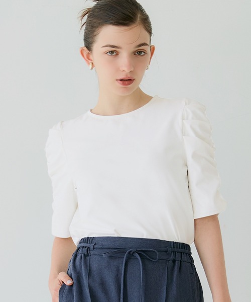 しなやかな光沢とギャザーディテールが上品に映える、シルキータッチトップス■デザイン・シルエット袖にたっぷりと施したギャザーが、程よく立体感を生むフェミニンなデザイン。デコルテをすっきり見せるラウンドネックで、カジュアルからきれいめまで幅広く活躍。ボディラインを拾いすぎないシルエットで、1枚でもインナーとしても使いやすい仕上がりです。■素材・なめらかで落ち感のある、シルキータッチ素材を使用・伸縮性に優れ、ストレスフリーな着心地・しわになりにくく、デイリーに嬉しいイージーケア素材■コーディネートデニムやスラックス、スカートなどボトムスを選ばず合わせやすい万能トップス。タックインしてもアウトしてもバランスよく着られ、オン・オフ問わず重宝します。一枚あると着こなしの幅が広がる、シーズンレスなアイテムです◎伸縮性:あり透け感:ホワイトのみ光に透かすとややあり裏地:なしポケット:なし生地感:さらりとした伸縮性のある生地注意点:ブラックのみ素材の特性上、色落ちしやすいのでご注意下さい。お洗濯方法によっては縮みや色あせの可能性あり。乾燥機等のご使用はお控え下さい。▼生地や素材の性質により2cm前後サイズ誤差が出る場合がございます。▼モデル着用写真は撮影環境により、多少実際のカラーと異なる場合がございます。▼色落ちの恐れがありますので、他のものと分けて洗って下さい。▼当商品は機械による生産の過程上、『生地を織る際の糸の継ぎ目』や多少の『ほつれ』、繊維の『混紡』、形やサイズに多少の『誤差』が生じる場合がございます。トップス ギャザー 伸縮性 半袖 ラウンドネック イージーケア 無地 シンプル きれいめ カジュアル 25ss コカ COCA coca COCA coca