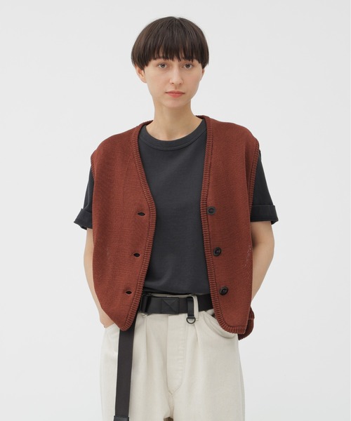 コットンに特殊なコーティングを施し、リネンのようなドライな質感とハリを加えた5ゲージのニットジレ。リネン特有の落ち感がなく、マットで安定感のある表情が特長。緩めのゲージで編み立てた身頃に、シャツテイルのようにラウンドさせた裾や、編み続きで仕上げたワイドな見返しを組み合わせたデザイン。背面にはハーフムーン型の補強を加え、レイヤードしたときにも映える仕上がり。軽やかさがあり、Tシャツの上からも気軽に重ねられ、シーズンを通して活躍する一枚。※こちらはウィメンズの商品です。▽お気に入り登録<商品のお気に入り登録>完売カラーの再入荷通知や、ラスト1点の通知、セールの通知も受け取ることができます。<ブランドのお気に入り登録>新商品や再入荷など、いち早くブランドの情報を受け取ることができます。