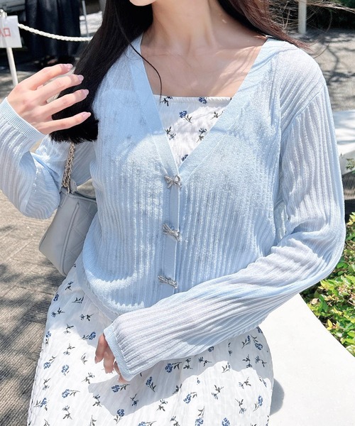 【夏は紫外線&冷房対策、秋は羽織りに大活躍の大人可愛いカーディガン】 ▼Design バランス良く着こなせるコンパクトシルエットのカーディガン。 透け感のあるシアー素材で仕立てているので軽やかな雰囲気です。 キラキラのラインストーンを敷き詰めたリボンボタンが華やかなアクセントに。 裏はスナップボタンになっているので開け閉めも楽チンです。 すっきりと開いたVネックも◎。 短めの丈なので、キャミワンピースやノースリーブトップスとの相性も抜群。 気になる肌見せもナチュラルにカバー◎ 合わせるインナー次第で様々な着こなしを楽しめます。 ▼Styling カジュアルなデニムコーデはもちろん、ドレスやオケージョンシーンにもぴったり。 夏には冷房の寒さ対策としても活躍する1枚です。 ・フロントリボンボタン下にスナップボタンあり ・ニット製品のため生地に伸縮性があり、サイズに若干の誤差が生じる場合がございます。予めご了承くださいませ。 【以下クロ参考。カラーにより多少の誤差あり】 ・透け感:透ける ・伸縮性:あり ・生地の厚さ:薄め ・裏地:なし ▼Recommend ・カーディガン ・シアー ・透け感 ・大人かわいい