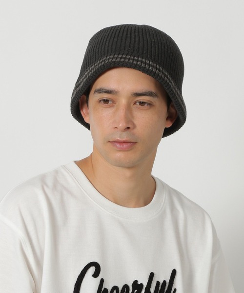 ニット素材のハット。柔らかく頭にフィットしてかぶりやすいです。ライン使いが程よいアクセントになります。薄くたためるので、出先にも持出やすいのもポイントです。