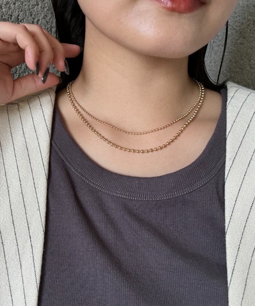 さりげない輝きをプラス。2連ボールチェーンネックレス!!いつものコーディネートに、ちょっとしたアクセントを加えたいあなたへ。ステンレス素材の2連ボールチェーンネックレスは、シンプルながらも存在感のあるアイテムです!大きさの異なるボールチェーンが2連になっていることで、首元に奥行きと動きが生まれ、洗練された印象を与えます。華奢なボールチェンなのでカジュアルすぎず、キレイ目なスタイリングにも使いやすい◎ステンレス素材なので、アレルギー体質の方でも安心して着用いただけます!また、変色しにくく、お手入れも簡単なので、長く愛用していただけます♪■長さ長いネックレス 43cm短いネックレス 40cm■重さ9g▼気になる商品をお気に入り登録ハートをクリックして《お気に入り登録》がオススメです!※画像の商品はサンプルを使用しております。実際の商品と若干の仕様が変更になる場合がございますので、予めご了承の上ご注文くださいますようお願いいたします※屋外の光や照明の当たり具合で、実際の商品の色味とカラー別画像の色味に若干の違いが発生する場合がございます。詳細画像と併せてご確認の上、ご注文いただきますようお願い致します。※独自のタイムセールなどの施策により、実店舗と価格差が発生する場合がございます。※実際の店舗在庫につきましては、各店舗に直接お問い合わせください。
