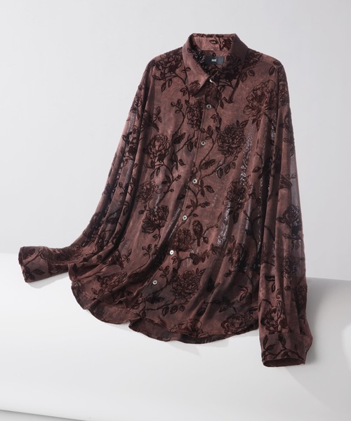 ーーー ムラ染めした生地にレトロなフラワー柄をプリントしたシャツ ーーー DESIGN 起毛した質感でベルベット調の肌触りが特徴のフロッキープリントでレトロなフラワー柄を落とし込んだデザイン。 ボディ全体の生地をムラ染めして奥行きのある印象に。 程よいゆとりを持たせたサイズ感で、ラフに着用できます。羽織りとしても使いやすくて〇 MATERIAL 光沢感のあるポリエステル素材で、綺麗な表面感が魅力。 ポリウレタンを混紡しており、伸縮性があるため着心地抜群です。 シワになりづらく、お手入れしやすいのもポイント。