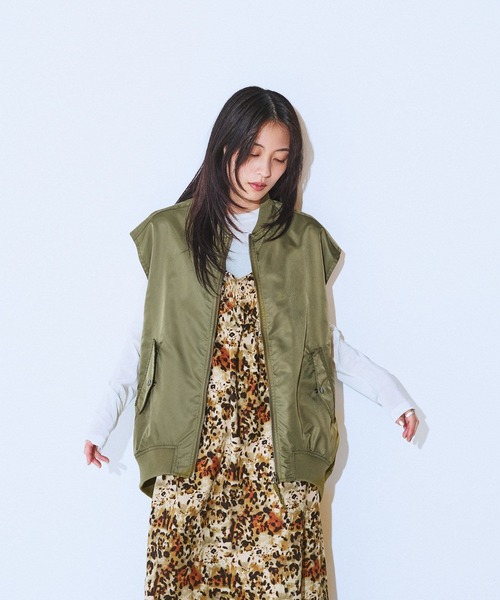 ーーー合わせるアイテム次第で長い季節楽しめる♪着こなしの幅が広がるMA-1ベストーーー■Design袖をカットオフしたようなモードなバランスが魅力のアイテム。背中にギャザーを寄せることで、メンズライクになりすぎないようこだわった1着です。前後差のある着丈がスタイリングに奥行きを与え、細身からワイドと幅広いシルエットのボトムと合わせられます。腰周りをすっぽりと覆う着丈なので、さりげなく体型カバーが可能◎大きめのアームホールで、厚手のニットやスウェットを着てももたつかないところがうれしいポイントです■Material ナイロンツイル素材を使用し、本格的なMA-1を再現しました。程よくハリがあるので、丸く立体的なシルエットに◎光沢感がキレイめな印象を与えます。裏地付きなので、中にニットを合わせても滑りが良く着用頂けます。■Styling合わせるアイテム次第で長い季節楽しめるアイテムです。秋口はシャツや薄手のロンTを着たり、ニットと合わせてもスタイリングがオススメです。デニムはもちろん、ナロースカートとの相性も◎-INFORMATION-◆お買い物をよりお楽しみいただく為に『♡』をクリックしてお気に入り登録がおすすめ!・完売カラーの再入荷通知や、ラスト1点の通知、セールになった際も通知を受け取ることができます★◆ブランドのお気に入り登録新商品や再入荷など、お得な情報を受け取ることができますので、是非ご登録ください♪※屋外の光や照明の当たり具合で、実際の商品の色味とカラー別画像の色味に違いが発生する場合がございます。 商品の色味はスタジオ撮影の詳細画像にてご確認ください。