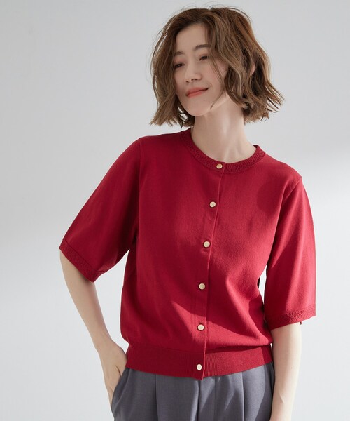 軽やかで上品なサマーニットカーディガン 【デザイン】 身頃は天竺編み、衿と袖口にはアイレット編みを施したハーフスリーブカーディガン。 編地の表情変化とバイカラーがアクセントになっています。 ゆとりのある袖幅とコンパクトな丈感で、バランスの取れたデザインに。 フロントには華やかさを添えるゴールド釦を配し、前を閉めてプルオーバー感覚での着用もおすすめです。 【素材】 さらりとした肌触りが心地よいニット素材を使用し、暑い時季にも快適なライトな着用感を実現しました。 透け感をあまり気にせず1枚で着られる程よい肉感です。 【スタイリング】 ワイドパンツやボリュームスカートとの相性が良く、タックインしなくてもすっきり決まるコンパクト丈。 羽織りとしてはもちろん、前を閉じてトップス風に着ることで着こなしの幅が広がります。 夏らしく品のある着こなしを叶える一着です。 ※照明の関係により、実際よりも色味が違って見える場合があります。また、パソコン・スマートフォンなどの環境により、若干製品と画像のカラーが異なる場合もございます。 【25AW】 モデル情報:身長166cm B80 W59 H86 着用サイズ:02(M) 店舗へのお問い合わせ商品番号:768-33004 ●製品寸法: 01(S):着丈50cm B87cm 袖丈27cm 肩幅34cm 02(M):着丈52cm B90cm 袖丈28cm 肩幅35cm 03(L):着丈54cm B93cm 袖丈29cm 肩幅36cm 04(LL):着丈56cm B96cm 袖丈30cm 肩幅37cm 05(3L):着丈58cm B99cm 袖丈31cm 肩幅38cm 備考: