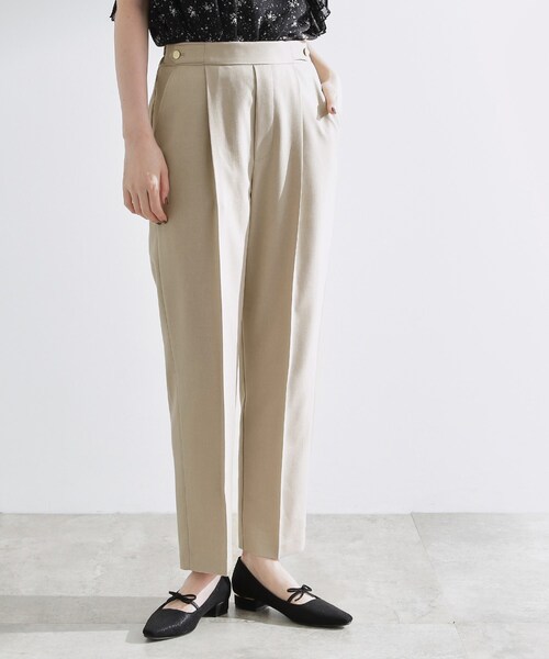 毎日洗えて頼れるパンツ 美脚ラインキープパンツ【デザイン】すっきり見えするテーパードシルエットのクロップドパンツです。ウエストにはタブとゴールドボタンを施し、さりげないアクセントに。センタープレス入りで、美しい脚のラインを演出します。後ろウエストはゴム入りの穿きこみタイプ。らくちんな穿き心地ながら上品見えするのが嬉しいポイントです。【センタープレスキープ加工】センタープレスの裏側に特殊な樹脂加工を施しており、洗濯してもセンタープレスのラインが消えずにきれいなまま着用いただけます。ご自宅の洗濯機で洗えてアイロンも簡単。忙しい毎日でもきれいをキープできます。【素材】ナチュラルストレッチのポリエステルツイル素材を使用。さらりとしたタッチですが、ややメランジ見えする奥行感ある表情が特徴です。【スタイリング】クロップド丈なので足元がすっきりと見え、パンプスやローファーはもちろん、ローテクスニーカーとも好相性。ブラウスをインしてきれいめに、Tシャツやニットを合わせてカジュアルにも着こなせます。ジャケットスタイルにもぴったりのきれいめパンツです。【センタプレスキープシリーズ】768-63003 ワイドシルエット768-63004 テーパードシルエット 【仕様】・ポケット数:横×2 後ろ(ダミー)×2・ウエスト後ろゴム・裏地なし※照明の関係により、実際よりも色味が違って見える場合があります。また、パソコン・スマートフォンなどの環境により、若干製品と画像のカラーが異なる場合もございます。【25AW】モデル情報:身長166cm B80 W59 H86 着用サイズ:02(M)店舗へのお問い合わせ商品番号:768-63004●製品寸法:01(S):W67~89cm H99cm 股下65cm 前股上30cm 渡り幅30cm 裾幅17cm02(M):W70~92cm H102cm 股下65cm 前股上30cm 渡り幅31cm 裾幅18cm03(L):W73~95cm H105cm 股下65cm 前股上30cm 渡り幅32cm 裾幅18cm04(LL):W76~98cm H108cm 股下65cm 前股上31cm 渡り幅34cm 裾幅19cm05(3L):W79~101cm H111cm 股下65cm 前股上31cm 渡り幅35cm 裾幅19cm備考: