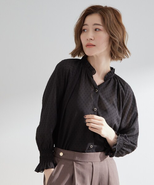 昨年ご好評いただいたシフォンドビーブラウスに、オンブレーチェック柄が登場!クラシックなムードと抜け感が共存した主役ブラウス【デザイン】袖口のシャーリングがアクセントになったボリュームブラウス。ラグランスリーブでアームホールを大きくとり、裾に向かって広がるボリュームシルエットが華やかで、ぱっと着るだけで雰囲気のあるデザインです。衿元はフリルのデザインですが、あえて第一釦を作らずスキッパー衿にすることで、甘さを抑えて大人っぽくまとめています。金縁のくるみ釦で、モダンなアクセントもプラスしています。【素材】繊細なシフォンドビー素材と今年らしいオンブレーチェックの2素材展開です。シフォンドビー素材は優しい透け感で、大人っぽい雰囲気を演出してくれます。チェックプリントは3配色構成で、奥行のある色合いに。さらりとしたポリエステル素材で、きれいめすぎず洒落感のある印象になっています。【スタイリング】袖口をプッシュアップして袖にボリュームを持たせて着用いただくのがおすすめ。センタープレス入りのきれいめパンツを合わせるとオンシーンにも、デニムでカジュアルに着用いただくのもおすすめです。スカートを合わせるときは、腰周りのボリュームを抑えたシルエットが好相性です◎。※照明の関係により、実際よりも色味が違って見える場合があります。また、パソコン・スマートフォンなどの環境により、若干製品と画像のカラーが異なる場合もございます。【25AW】モデル情報:身長166cm B80 W59 H86 着用サイズ:02(M)店舗へのお問い合わせ商品番号:768-83021●製品寸法:01(S):着丈61cm B112cm 裄丈67cm02(M):着丈62cm B115cm 裄丈68cm03(L):着丈63cm B118cm 裄丈70cm04(LL):着丈64cm B121cm 裄丈71cm05(3L):着丈65cm B124cm 裄丈72cm備考: