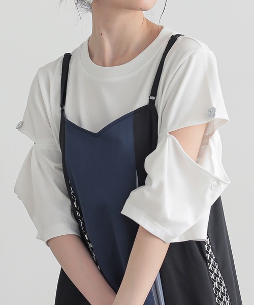 二の腕カバーが叶う!抜け感トップス。 スラッシュあきにタックを組み合わせた大人の印象漂うドレープカットソー。 サロペットやジャンパースカートのインナーでもごわつかないサイズ感です。 袖のボタンを閉じたり、開けたりすることで2種類の見え方をお楽しみいただけます。 裾は前後差のある着丈で腰回りをカバーしてくれる。 様々なボトムスとも相性がいいので着回しも効くデザインです。 しわになりにくい、頼れる一枚。 柔らかな風合いが魅力の、しわになりにくいカットソー素材を使用。 快適な着心地で、デイリーに活躍します。