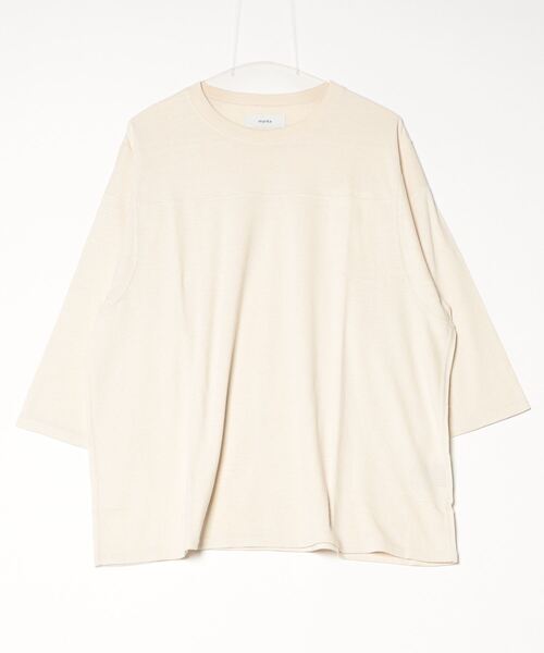 【デザイン】・柔らかな肌ざわりが特徴のノイルシルク天竺を使用したボールゲームTシャツ・ネップがありコットンライクな風合いだが、シルク特有のヌメリや落ち感がニュアンスを添える一着・肩や袖の切り替えがさりげないアクセントになったデザイン・スリークオータースリーブ(七分袖)は袖を捲り、こなれ感を出した着こなしもおすすめ【素材】・短繊維の絹紬糸(ノイルシルク)は空気を含んだ肌あたりの良さが特徴・吸湿性に優れたシルク本来の特性を持ちつつ、コットンにはない独特な表情が魅力・ご自宅でのイージーケアが可能【シルエット・サイズ】・ゆったりとしたルーズフィット