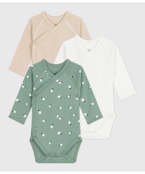 リンゴプリント、ヒツジプリント、プレーンカラー、ミラレボーダーを揃えた長袖あわせボディ3枚セットです。環境にやさしく、第二の肌と呼ばれるほど心地よい肌触りの1x1リブ編みコットンを使用し、快適かつナチュラルな着心地を実現。お着替えがしやすいよう、スナップボタンが施されているので外出時も安心。何枚あっても嬉しいアイテムは、出産祝いなどのギフトにもおすすめです。※プリントは永久的なものではなく、もみや摩擦でひび割れたり、繰り返しの洗濯によるプリントの変色や、脱落が生じる場合があります。中性洗剤などで単独洗いをしてください。