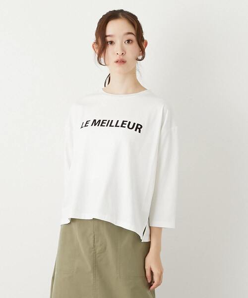 微光沢のコットン天竺のややワイドでクロプドの8分袖Tシャツ。 LE MEILLEUR (フランス語『最高』という意味)フロッキープリントで施しています 。大人なフォント使いでベストやサロペット等におすすめなTシャツです。 ※画像の商品はサンプルです。実際の商品と色味、仕様、加工、サイズ、素材等が若干異なる場合がございます。