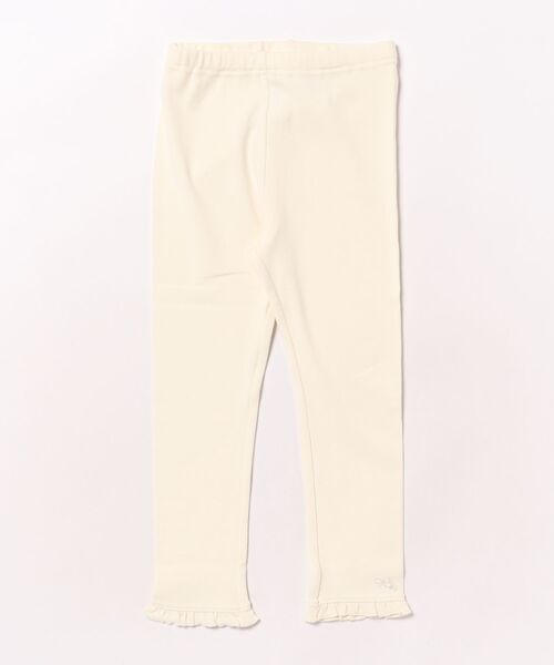 やわらかいストレッチスムース素材のフルレングススパッツです。裾口のフリルと、さりげない左裾のワンポイント刺しゅうがポイント。ベーシックで、シンプルなデザインで、コーディネートに取り入れやすい便利なアイテムです。