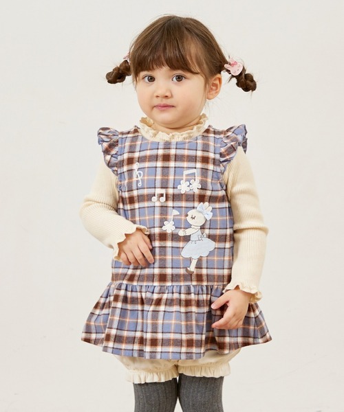 先染チェックのチュニックとやわらかな天竺素材のブルマのセットアップ。前身頃には、mimiちゃんのアップリケ刺しゅうが、後ろ身頃には小さな花のレースが付いています。ベビーギフトにも最適のアイテムです。