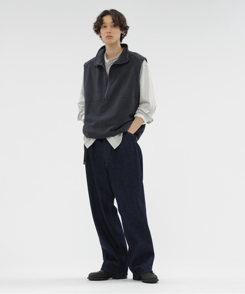 テキサス産オーガニックコットンを使用した、13.75オンスのデニムブルゾン。一般的なデニムよりも軽く柔らかな着心地で、着用を重ねることで繊細なタテ落ちが生まれる奥行きのある表情。混じり気のないインディゴブルーと、部位に応じて使い分けたネイビーと金茶のステッチが特徴。ヴィンテージのミリタリーパンツから着想を得た、中心寄りの2本タックが目を引くデザイン。腰まわりに適度なゆとりを持たせ、裾に向かってテーパードするラインがポイント。細幅の三つ折り仕上げや片側のみのヒップポケットなど、さりげない抜け感を加えた一本。同素材のブルゾン品番:596-5225200※こちらはMHL.SHOP・オンラインショップ限定の商品です。※こちらはメンズの商品です。▽お気に入り登録<商品のお気に入り登録>完売カラーの再入荷通知や、ラスト1点の通知、セールの通知も受け取ることができます。<ブランドのお気に入り登録>新商品や再入荷など、いち早くブランドの情報を受け取ることができます。