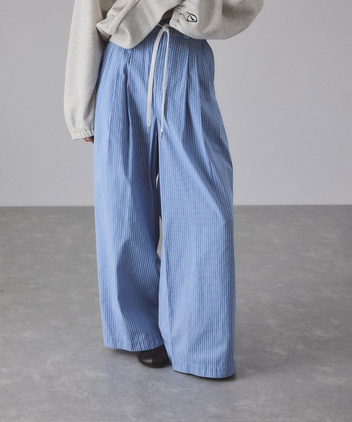 《セットアップ対応》シンプルながらも洗練された印象を与える一着。程よいワイドシルエットと細かなストライプが、大人のこなれ感を演出してくれるシャツスラックス◆2025-26秋冬◆ ADAM ET ROPE' FEMME 【Material】 ベージュ...ナイロン混のパサっとしたタッチと、コットン混の肌馴染みの良さが特徴の素材。 サックス...細い糸で高密度に織られたコットンストライプ素材。目の詰まったクリアな表面が特徴。 【Design】 タックスラックスデザインでウエストにぐるり紐を通す事でイージーな雰囲気のシャツ素材スラックス。 紐をギュッとギャザーを寄せたような魅せ方にもできるように、ベルト部分は柔らかく仕上げたデザイン。 また、紐を通すホールは前後に開いている事で、紐を表面にだしたり裏面に隠したりとお好みで出し引きできるのも嬉しいポイント。 シャツ生地でのボトムはパジャマに見えないスラックスデザインと、ワイドな筒の太さが程よくマッチした、モードさと抜け感を演出してくれる一着。 ◇同素材でタックスリーブシャツ(品番:GAH25050)もご用意しております。 【Color】 肌馴染みのよいベージュベースにブラックピンストライプ、爽やかなサックスをベースに白と濃いネイビーのラインの細ピッチストライプの2色展開。 【Styling Point】 セットアップでの着用はもちろんの事、Tシャツやニットトップス合わせなどもおすすめ。 --------------- 透け感:なし 裏地:なし 伸縮性:なし 光沢感:なし 生地の厚さ:やや薄手 ---------------