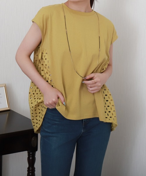 レースの透け感で上品に肌みせ! 一枚でしっかりコーデの主役になるアイテムです。■point・フレンチスリーブ・両サイドにレース切り替え・フレアシルエット・ゆったり身頃・長めの丈感■design両サイドのレースとアクセントのリボンが作りだす大人フェミニンなトップス。ゆるとしたディテールがこなれた印象に。フレアシルエットがお腹周りをカバーお尻が隠れる丈感なのも嬉しいポイント。綿100%で着心地良くデイリーユースにピッタリのアイテムです!■fabric柔らかく肌さわりの良いコットン素材……………………透け感:淡色は若干あり厚さ:普通裏地:なし光沢感:なし伸縮性:ありポケット:なし洗濯方法:洗濯機・ドライクリーニング・ウェットクリーニング……………………※ネットに入れてのお洗濯をお勧めいたします。※詳しいお手入れ方法は商品タグをご参照ください。■coordinate一枚でしっかりコーデの主役になるアイテムです。------------------------------《商品のお気に入り登録》・再入荷通知や、ラスト1点の通知、セール通知も受け取ることができます。《ブランドのお気に入り登録》・新商品や再入荷など、お得な情報を受け取ることができます。※屋外の光や照明の当たり具合、パソコンなどの閲覧環境によって実際の色味と異なって見える場合がございます。予めご了承ください。※他のキャンペーンにより、期間中に価格が変動する場合があります。※ご注文いただいた予約商品のお届け時期の確認は、注文履歴ページより行えます。------------------------------
