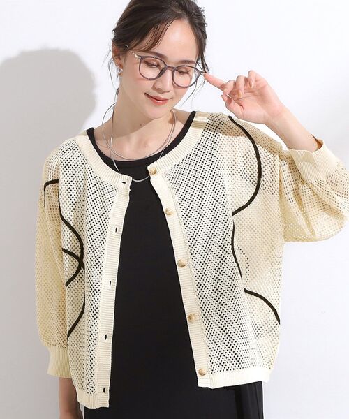 【デザイン】にょろにょろとしたニュアンス柄の刺繍デザインのメッシュカーディガン。前後2WAYで着られるので、気分やお好みに合わせて様々な着こなしができます。身幅がゆったりめなのでカーディガンとしても使いやすいです。バランスのとりやすい長すぎない丈感で、どんなボトムにも合わせやすい1枚です。【スタイリング】いつものスタイルにさっと羽織るだけでこなれた印象になります。ボタンを後ろにしてトップスとしても着られて、ボタンを閉じてトップス風にして着こなすこともできます。【素材】リネンライクのアクリル素材で、ドライタッチのニット。メッシュ編みなので、暑い時期にも着やすいサマーニットです。※照明の関係により、実際よりも色味が違って見える場合があります。また、パソコン・スマートフォンなどの環境により、若干製品と画像のカラーが異なる場合もございます。#CutieBlonde#Cutie#cutieblonde#cutie#キューティブロンド#キューティモデル情報:身長163cm B81 W59 H88 着用サイズ:02(M)店舗へのお問い合わせ商品番号:256-32012●製品寸法:01(S):着丈47cm B108cm 袖丈31cm 肩幅52cm02(M):着丈49cm B112cm 袖丈32cm 肩幅53cm03(L):着丈51cm B115cm 袖丈33cm 肩幅55cm04(LL):着丈53cm B118cm 袖丈34cm 肩幅57cm備考: