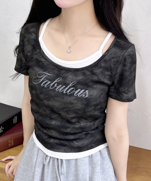 【レイヤード風のドッキングデザインは1枚ですっきり見え】 ボディにフィットするコンパクトなシルエットでスタイルアップも狙えるトップスです。 キャミソールにカットソーを重ねたようなデザインが◎。 広めに開いたネックラインがデコルテラインをキレイに見せてくれます。 フロントのかすれロゴでヴィンテージ感のある仕上がりに。 ・キャミ取り外し不可 【以下メイサイ/クロ参考。カラーにより多少の誤差あり】 ・透け感:透けない ・伸縮性:あり ・生地の厚さ:普通 ・裏地:なし