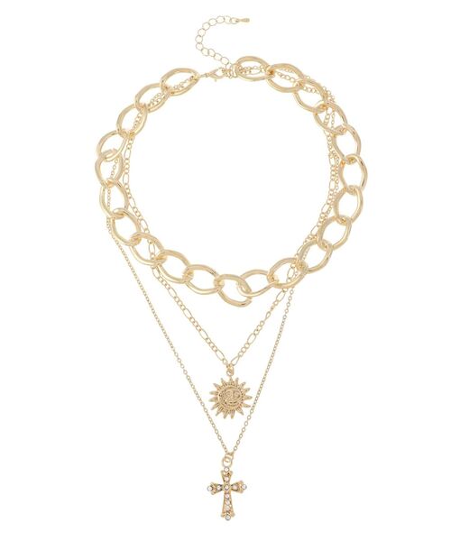 EVRISで人気の3連ネックレスの、新しいクロスモチーフが付いたネックレスです。ワイドなチェーンと、SUNNY・クロスモチーフの組み合せが他にないデザインになっております。 存在感のあるアクセサリーなので、首元を華やかな印象にしてくれます。 首元の開いたお洋服に合わせるのがオススメです。