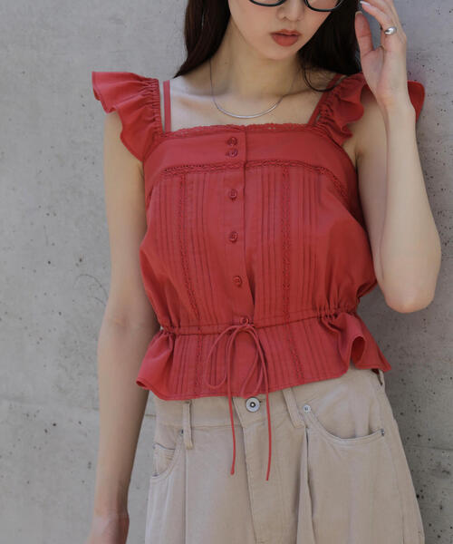 華奢なレースとピンタックが雰囲気のあるキャミブラウス。ヴィンテージライクな粗野で細番手の軽やかなコットン生地を使用。 細いストラップは長さ調節できます。 フリルスリーブはゴム仕様なので肩に程よくフィット、二の腕まで下げてヘルシーな肌見せも楽しめる2wayデザイン。 後ろウエストはゴムとギャザーが入っているペプラムラインで、フロント脇から通したドロストリボンは絞れます。 1枚着はもちろん、インナーにコンパクトTシャツやベアトップとレイヤードすると、ビスチェのようにも着こなせます。 デニムなどカジュアルなボトムスと相性バツグン。ジャケットのINにもおススメです。 ※モデルの着用画像の場合、光の当たり具合により、実際の色味と異なって見えることがございます。色味は、商品単体の画像をご参照ください。 商品特性 ■透け感:なし ■生地の厚さ:普通 ■裏地:なし ■伸縮性:なし ■光沢:なし ■シルエット:スタンダード --------------------------------------------------- ◆商品のお気に入り登録◆ お気に入りアイテムの値下げ・再入荷・在庫1点などの通知を受け取ることができます。 ◆ブランドのお気に入り登録◆ 新商品や再入荷、セール、クーポン配布などお得な情報を受け取ることができます。 ---------------------------------------------------