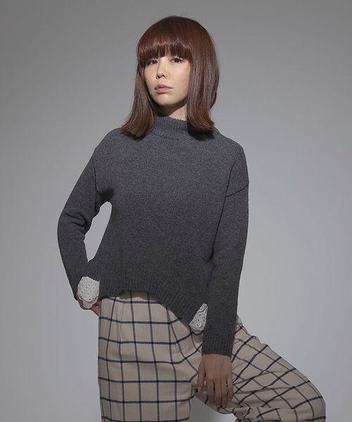 バックスタイルに注目♪愛らしさ満点のレディアイテムの登場です☆ 裾部分にレース&シフォンを施したニット。女性らしいシルエットにこだわった変形デザインとバックフリルがポイントです。 首元はちょっぴりハイネックが今の気分♪甘さを抑えたいならパンツスタイルで。スカートをあわせて思いっきりガーリーを楽しむのもおすすめです。