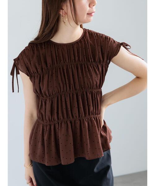シャーリングのふんわり感とドットプリントが可愛らしいブラウス。 肩に施されたリボンも甘さをプラスするアクセントに。 小さめのドット柄で大人っぽい印象を演出してくれるのもポイント◎ パンツやスカートなど、様々なボトムスともバランスよくマッチしてくれる1着です。 ※商品画像は、撮影環境やお客様のご利用のPC・スマートフォンのモニター環境などにより実物と色味に差異がある場合がございます。