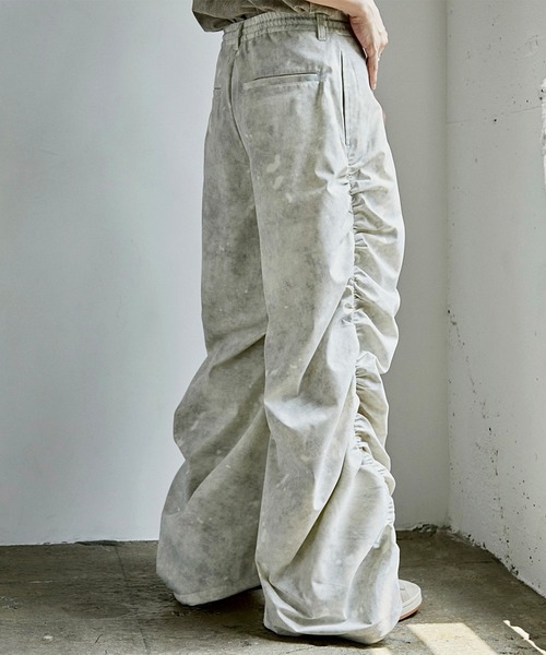 " Spielio /シュピーリオ" ~ シルエットの変化を楽しめる、立体感ワイドパンツ ~ - design - ルーズなワイドシルエットに、シャーリング加工で立体感を加えた存在感あるデザインパンツ。裾にはドローコードを施し、ストレートから丸みのあるバルーンシルエットまで自在に調整可能。ウエストは総ゴム×スピンドル仕様でストレスフリーな穿き心地を実現しつつ、ベルトループ付きでタックインや小物使いもスマートに対応。機能性も兼ね備えた両脇のスラッシュポケットと、左右のバックポケットで実用性も抜かりなく。スタイリングに合わせてシルエットも表情も自在に変化できる一本です。 - material – ホワイトは表地・裏地ともにポリエステル100%、グレー・ブラックはポリエステル100%の一枚仕立て。綾織り特有の自然な光沢とドレープ感があり、軽やかでシワになりにくく、日常使いに最適な素材感です。全面に施されたスモーク柄は、色ムラ・かすれ感・抜け感を表現し、奥行きのあるヴィジュアルに仕上げています。独特の柄行きがスタイリングにアクセントを加える、存在感のある素材です。 - color - ホワイト:軽やかでクリーンな印象。スモーク柄の表情がより際立ち、抜け感あるスタイルに。 グレー:中間色ならではのニュアンスがあり、柔らかさとシャープさを兼ね備えた万能カラー。 ブラック:深みのあるカラーにスモーク柄の濃淡が映え、シックでモードな雰囲気を演出。 - セットアップ着用可能アイテム - 品名: 【Spielio】Fade patterned shirred design shirt/ フェード柄シャーリングデザインシャツ 店舗:SPIsh1550 ZOZO:95944551 【ご使用上のお願い】 ・濃色製品は、色落ちすることがあるので、他のものと分けて洗ってください。 ・つけ置き洗い、濡れたままの放置は避け、洗濯後は形を整えて直ちに陰干ししてください。 ・色移りの恐れがありますので、濡れたまま他の衣類と重ねないでください。 ・雨などに濡れた際は、放置せずに水分を十分に取り除いてください。 ・生成り、淡色は蛍光増白剤の使用をお避けください。 ・濃色製品は、色落ちすることがあるので、他のものと分けて洗ってください。 ・洗濯の際は洗濯ネットをご使用ください。 ・アイロン時はあて布をご使用ください。 ・摩擦(特に湿った状態での摩擦)や雨・汗などで、他の衣料やバッグ等の周りのものに色移りすることがありますのでご注意ください。 ・この製品は、直射日光等により退色・変色する事がありますので、お取り扱いにはご注意ください。 ※撮影画像は光の当たり具合で色味が多少異なって見える場合があります。予めご了承くださいませ。 ※末永くご愛用いただく為に、アテンションタグ・洗濯ネームを必ずご確認の上お取り扱い下さい。 《推奨サイズ》 サイズS : 〜168cm サイズM : 169cm〜174cm サイズL : 175cm~ ※標準体型を基にした目安ですので、好みや体型によって個人差があります。 - Spielio /シュピーリオ - Spielioは「洗練」された「遊び」 クールで都会的なモダンさをベースに、固定観念にとらわれないユニークさを追求。 混じり気のない粋なファッションを提唱していく。 〈商品のお気に入り登録〉 完売カラーの再入荷通知や、ラスト1点、セールの通知をお知らせいたします。 〈ブランドお気に入り登録〉 新商品や再入荷など、いち早くブランドの情報を受け取ることができます。