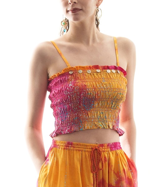 まるでインド映画に出てきそうなエキゾチック感あふれるチューブトップ。 大胆なタイダイ染めに、スクリーンプリントとメタリックプリントでエスニック柄を表現した華やかな一着。 胸元のコインチャームも目を惹きます。 ゴムシャーリングで伸縮性のあるデザイン。 肩紐を付けてキャミソールとしてもご着用いただけます。 個性的で華やかなエスニックスタイルに◎ ・肩紐は取り外し可能です。 ※こちらの商品は1点1点職人による手作り・ハンドメイドとなります。その為、生地の取り方により柄の配置や形・色合い・染め模様など若干個体差がございます。(画像は一例です。)あらかじめご了承ください。 ※屋外での撮影画像は、光の当たり具合で色味・カラーが違って見える場合がございます。商品のカラーは、スタジオ撮影の画像をご参照ください。 Amina Collection Co.,LTD.