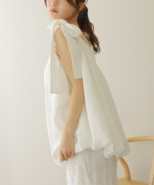ふわっと膨らむ裾バルーンのシルエットで魅せるノースリブラウス。 肩で揺らめく幅広のリボンがスイートな雰囲気を高めます。 スクエアネックを採用することでデコルテがスッキリと見え、甘さが程よく抑えられているのがポイント。 ボリュームが出がちなデザインも、生地に落ち感があるのでスッキリとした印象です。 着丈はヒップが隠れる長さがあり、体型カバーにもピッタリ。 フルレングスのボトムはもちろん、ショートパンツやスカートを合わせた着こなしもおすすめです。 ■DETAIL ・透け感:ややあり ・生地の厚さ:普通 ・裏地:なし ・伸縮性:なし <注意点> ・色合いはモニター環境により若干の誤差が出ます。 ・サイズは測り方により若干の誤差が出る場合がございますが、予めご了承ください。 ・入荷・生産時期により、色、サイズ、素材など多少異なる場合がございます。 ・本製品は生産過程におきまして、生地を織る際の糸の継ぎ目や多少のほつれが生じることがあります。 ・簡易包装となっており、保管・梱包時にシワが伴う場合がございます。