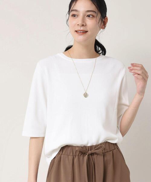 【デザインポイント】 前後2WAYで着用できるよう、襟回りのサイズ感を調整しています。 プルオーバーとしても、羽織としても着用でき、着回し力のある1着です。 華奢なゴールドのボタンが着こなしのポイントになります。 【スタイリングポイント】 すっきりとしたサイズ感なので、ワイドパンツやフレアスカート等ボリュームのあるボトムとも相性よく着ていただけます。 上品な素材感なので、デニムやカジュアルボトムとあわせて頂いてもきれいにまとまります。 ワンピースの羽織りにもぴったりです。 【素材ポイント】 接触冷感、UVカット、マシンウォッシャブル機能のある素材を使用しています。 12ゲージの総針編みにし、程よい肉感で透けも気になりません。 ※この製品は、太陽光線中の紫外線(UV)を通しにくくします。この効果は永久的ではありません。br> ※照明の関係により、実際よりも色味が違って見える場合があります。また、パソコン・スマートフォンなどの環境により、若干製品と画像のカラーが異なる場合もございます。 モデル情報:身長168cm B81 W60 H89 着用サイズ:02(M) 店舗へのお問い合わせ商品番号:F58-13310 ●製品寸法: 01(S):着丈51cm B88cm 袖丈31cm 肩幅34cm 02(M):着丈53cm B92cm 袖丈31cm 肩幅34cm 03(L):着丈55cm B96cm 袖丈32cm 肩幅35cm 備考: