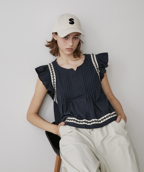 可愛くなりすぎず程よくカジュアルなピンタックブラウス ■design カジュアルな素材感とフリルのフェミニンさが絶妙なバランスのノースリーブブラウス。 肩にかかるフリルデザインが華やかさを、フロントのピンタックデザインが上品さを演出します。 デニムとの相性もよく、ON/OFF幅広くスタイリングをお楽しみいただけるアイテムです。 ■material やわらかい綿混素材を使用。 軽やかで暑い季節でも快適な着心地です。 ■styling カジュアルにスタイリングしやすいアイテムなので、定番のデニムやワイドパンツとの甘辛ミックスコーデがおすすめ。 腰にかかる程よい丈感でハーフパンツとの相性も◎ 透け感:あり 光沢感:なし 伸縮性:なし 裏 地:なし 厚 み:薄手 ノースリーブブラウス/ピンタックデザイン/フリル袖/夏服 --------------------------------------------------- ▶商品のお気に入り登録 完売カラーの再入荷通知やラスト1点の通知など お得なプライスダウンの情報も受け取ることができます。 ぜひご登録ください◎ ▶ブランドのお気に入り登録 新商品や再入荷など、ブランドの最新情報を いち早くお知らせします! ぜひご登録ください◎ --------------------------------------------------- ※撮影環境の光や角度により、実物と色味が異なる場合がございます。 ※着用、お取り扱いの際は、商品に付いている品質表示を必ずご確認ください。 ※生産時期により色味・加工感など多少異なる場合がございます。予めご了承ください。