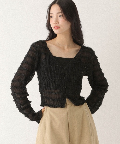 ーーー 【デザイン】 繊細なレースのフリルをたっぷりあしらった ジャガードカーディガン。 程よく透け感のあるシアー素材なので、 夏の日焼け対策から季節の変わりめの羽織まで ロングシーズン着用していただけます。 ーーー 【スタイリング】 インナーにはカップ付きリブキャミを合わせて 抜け感を演出するのがおすすめ。 ボトムスはスタイルを選ばず合わせやすいので 着回し万能です! ※屋外の光や照明の当たり具合で、実際の商品と画像の色味に違いが発生する場合がございます。 ※サンプルにて撮影をしておりますので、実際の商品とは仕様や加工・サイズ等が若干異なる場合がございます。 --------------------------------------------------------- ▼気になるアイテムはお気に入り登録がおすすめ!▼ 気になる商品は♡をクリックしていただくと、 ・在庫残りわずか ・再入荷 ・セールの情報 などの通知を受け取ることができます。 ▼ブランドのお気に入り登録も!▼ 新商品や再入荷、セール、クーポンの配布など、 いち早くお得な情報を受け取ることができます。 ぜひご登録ください♪