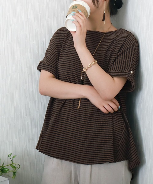 ラフに着こなす、ほんのりフェミニンなプルオーバー涼やかなシャーリング素材で夏でも快適な着心地!■point・さらりとしたシャーリング素材・バックフレア・無地とチェック柄・お尻が隠れる後ろ下がりデザイン・袖口にシャンパンゴールドの飾りボタン■designシワ感がナチュラルで、女性らしい印象のブラウスのようなカットソープルオーバー。ゆるやかに裾にむかって広がるフレアシルエットが大人カワイイ一着。ウエストラインの切り替えでスタイルアップ効果も!立体感のあるシャーリング素材は、シンプルなアイテムでもおしゃれに見え!シワ感があるため、持ち運びや洗濯後もシワが気になりません。■fabric通気性が良くて軽い着心地のカットシャーリング素材ゴムの様な伸縮性で、動きやすい。夏物やリゾートウェアにぴったりです。……………………透け感:淡色は若干あり厚さ:普通裏地:なし光沢感:なし伸縮性:ありポケット:なし洗濯方法:手洗い・ドライクリーニング……………………※ネットに入れてのお洗濯をお勧めいたします。※詳しいお手入れ方法は商品タグをご参照ください。■coordinateIラインスカートや、パンツなどスッキリとしたボトムに合わせてキレイめコーデに。オフ×クロのチェック柄にブラックのボトムスを合わせた、大人可愛いモノトーンコーデがオススメです。------------------------------《商品のお気に入り登録》・再入荷通知や、ラスト1点の通知、セール通知も受け取ることができます。《ブランドのお気に入り登録》・新商品や再入荷など、お得な情報を受け取ることができます。※屋外の光や照明の当たり具合、パソコンなどの閲覧環境によって実際の色味と異なって見える場合がございます。予めご了承ください。※他のキャンペーンにより、期間中に価格が変動する場合があります。※ご注文いただいた予約商品のお届け時期の確認は、注文履歴ページより行えます。------------------------------