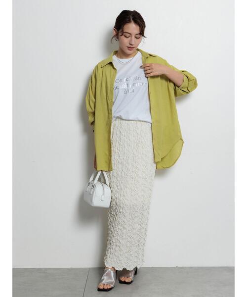 裏にゴムシャーリングを施して、凹凸感を表現した特殊な素材感が特徴のタイトスカート。エンブロイダリーシャーリングが豊かな表情をプラスし、凹凸感のあるデザインがシンプルながらも華やかな存在感を演出してくれます。ウエストはゴム仕様になっていて安心感のある穿き心地◎バックスリットを施し、抜け感を演出しながらスムーズな足さばきができるのが嬉しいポイント。タイトなIラインシルエットで品よくスタイリングすることができるアイテムです。※商品画像は、撮影環境やお客様のご利用のPC・スマートフォンのモニター環境などにより実物と色味に差異がある場合がございます。【その他採寸】F ウエスト:[ゴム仕様]64cm