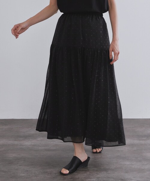 ラメドットジャカード素材の楊柳ティアードスカート 【デザイン】 ・さりげないラメドットジャカード素材がポイントのイージーティアードスカート。 ・ウエストがぐるりゴム仕様なので、楽な穿き心地が魅力。 ・ティアードデザインで、軽さもありながらボリューム感のあるデザイン。 ・ベーシックなTシャツやトップスなどと合わせても、華やかに決まるデザインスカートです。 【素材】 ・ラメドットジャガードが華やかな、軽さのあるポリエステル楊柳素材を使用。 ・マシンウォッシャブルでご自宅でのお洗濯も可能。 【仕様】 ・ポケットなし ・ウエスト総ゴム ・裏地あり ------------------ 【C(シー) OPAQUE.CLIP】 「PLAYFUL FEMININE」をキーワードに、天然素材と美しくポジティブなカラー、ワクワクするようなディティールや、 ミックス感のあるスタイルなどファッションの楽しさを詰め込んだ新レーベルです ※照明の関係により、実際よりも色味が違って見える場合があります。また、パソコン・スマートフォンなどの環境により、若干製品と画像のカラーが異なる場合もございます。 モデル情報:身長165cm B72 W57 H84 着用サイズ:38(M) 店舗へのお問い合わせ商品番号:637-73015 ●製品寸法: 36(S):W62~70cm H98cm 総丈87cm 38(M):W64~72cm H100cm 総丈88cm 備考: