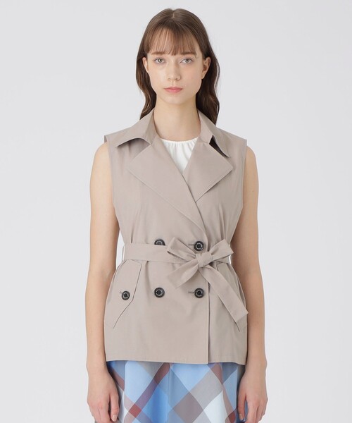 ◆暑い時期の羽織にぴったりなシアー素材ジレ 暑い時期の羽織りとして活躍するトレンチコートジレです。 程よい透け感のあるアイテムで、いつものコーディネートにプラスすることで、ぐっとお洒落度がアップするアイテムです。 ベルトはフロントできっちり結ぶのも良し、後ろで結ぶのも良し、外してもよし。お好みでスタイリングしていただけます。 【Styling】 クレストブリッジチェッククールドライドッキングドレス(55J01601)の羽織りとしてや、テレコカットソー(55P03605)とのスタイリングがおすすめです。 【Fabric】 接触冷感と吸水速乾機能を備えた素材です。