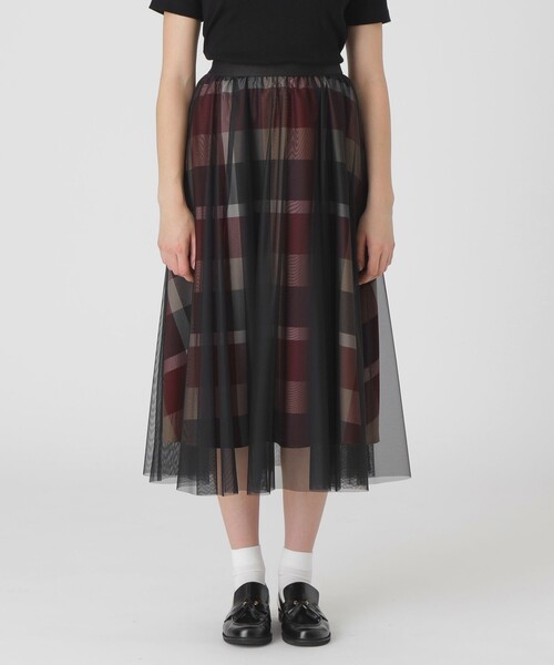 ◆クレストブリッジチェック×チュールのふんわりスカート【Design】チュールをたっぷり使ったエアリーなシルエットのスカートです。ウエストはゴム仕様で着心地快適です。シーズンレス、シーンレスに活躍するアイテムです。