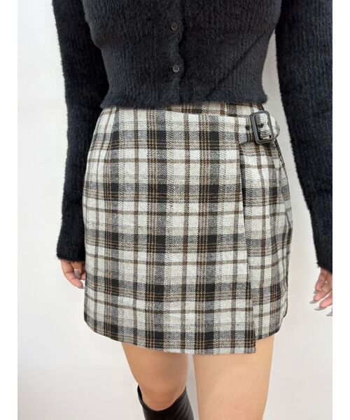 同素材ジャケットとセットアップで楽しめるチェック柄スカート。ラップ風デザインにバックルを添えたディテールがアクセントとなり、クラシカルな中にもトレンド感をプラス。インナーには裏地でショートパンツが付いているので、動きやすさと安心感も兼ね備えています。ミニ丈でもアクティブに着こなせる、きれいめカジュアルな1枚です。単品でも着回し力が高く、幅広いスタイリングに活躍します。■セットアップアイテム>>チェックルーズジャケット