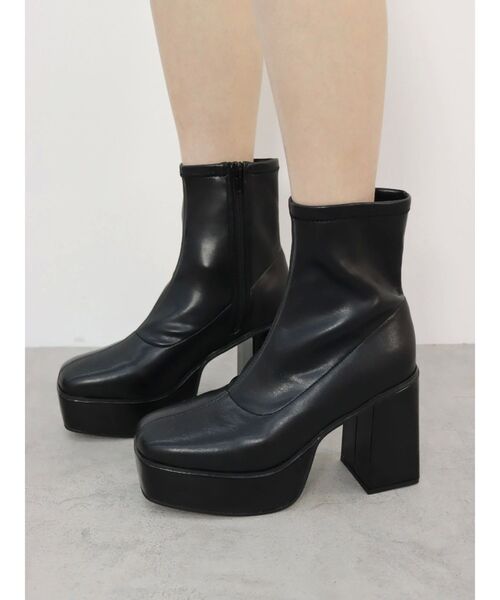 毎年定番のスリムチャンキーブーツです。ヒールが高すぎずしっかり幅のあるヒールを使用しているので、安定感のあるショートブーツです。つま先とかかとの高低差がありますが、インソールのクッションがしっかりしているので長時間着用していても疲れにくいブーツです。ブラックはフェイクレザー、ミックスはラメ感のある生地を使用しています。