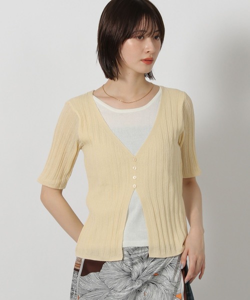 インナーとレイヤードしているように見えるデザインの半袖ニット。1枚でスタイリングが決まる万能アイテムです。細身のシルエットでも伸縮性のある生地感なので着やすく、コンパクトシルエットがトレンド〇【素材】伸縮性のある柔らかな素材感。インナーは前身頃だけなので着やすく、やや透け感があり涼し気な生地感です。【スタイリング】コンパクトなデザインなのでボリュームのあるボトムとの相性〇カーブデニムやウエストフックデニムなどカジュアルアイテムとのスタイリングもおすすめです。