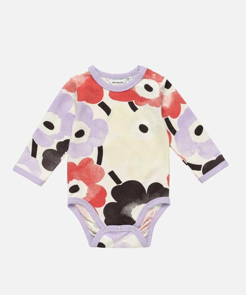 【テキスタイルデザイン:Maija Isola(マイヤ・イソラ)】 Unikko(ウニッコ):花愛らしくて上品なUnikko柄のロンパース。素肌にやさしいコットン素材にストレッチを加えて、着心地良さも抜群です。華やぎのあるデザインは、プレゼントにも最適です。※品質表示は、Marimekko社の付けた洗濯表示を日本国内の基準に合わせ付け替えております。本国のタグはカットされておりますので、予めご了承ください。※断裁により商品ひとつずつの柄の出かたが異なるため、表示画像のディテールと多少異なるデザインのものが届く場合がございます。予めご了承ください。<marimekko キッズウエアサイズチャート>62サイズ 3ヵ月 68サイズ 6ヵ月 80サイズ 9ヵ月~12ヵ月 92サイズ 18ヵ月~2歳 104サイズ 4歳 116サイズ 5~6歳 128サイズ 7~8歳