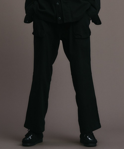 コットンヘリンボーン素材のクルーパンツ。マチ付きハンド、ヒップポケット。ウエストリフレクター入りドローコード。バックサイドヘムにドローコード。スナップボタン付きヒップポケット。ワイドストレート。